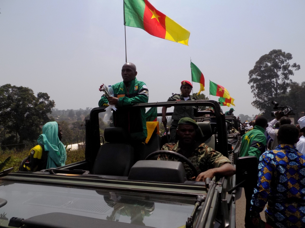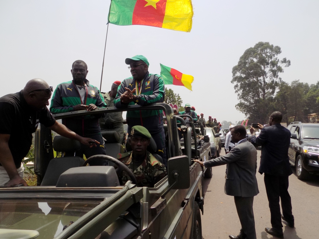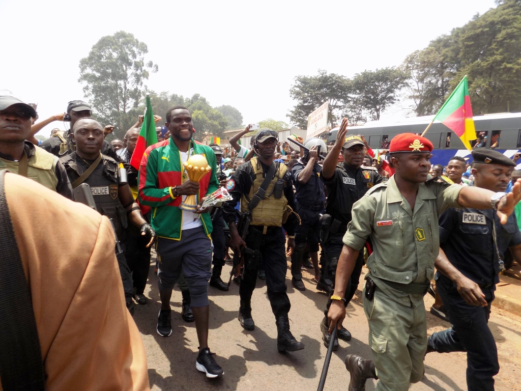 La caravane du trophée de la CAN2017 est de passage dans la région de l’Ouest. Elle a été accueillie par une foule en délire, ayant massivement pris d’assaut l’itinéraire qu’empruntaient les jeeps transportant la délégation, qui voulait avancer et toucher le sésame. Deux Lions Indomptables de l’expédition victorieuse accompagnaient le trophée: Michael Ngadeu Ngandjui et Jonathan Ngwem.