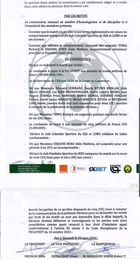 Pour l’attitude des joueurs et encadreurs jugées anti sportives, Colombe sportive du Dja et Lobo est condamné à verser une amende de 30 millions de Fcfa à la Fécafoot. Dans la foulée, le ciel est exclu de l’édition 2026 de la Coupe du Cameroun.