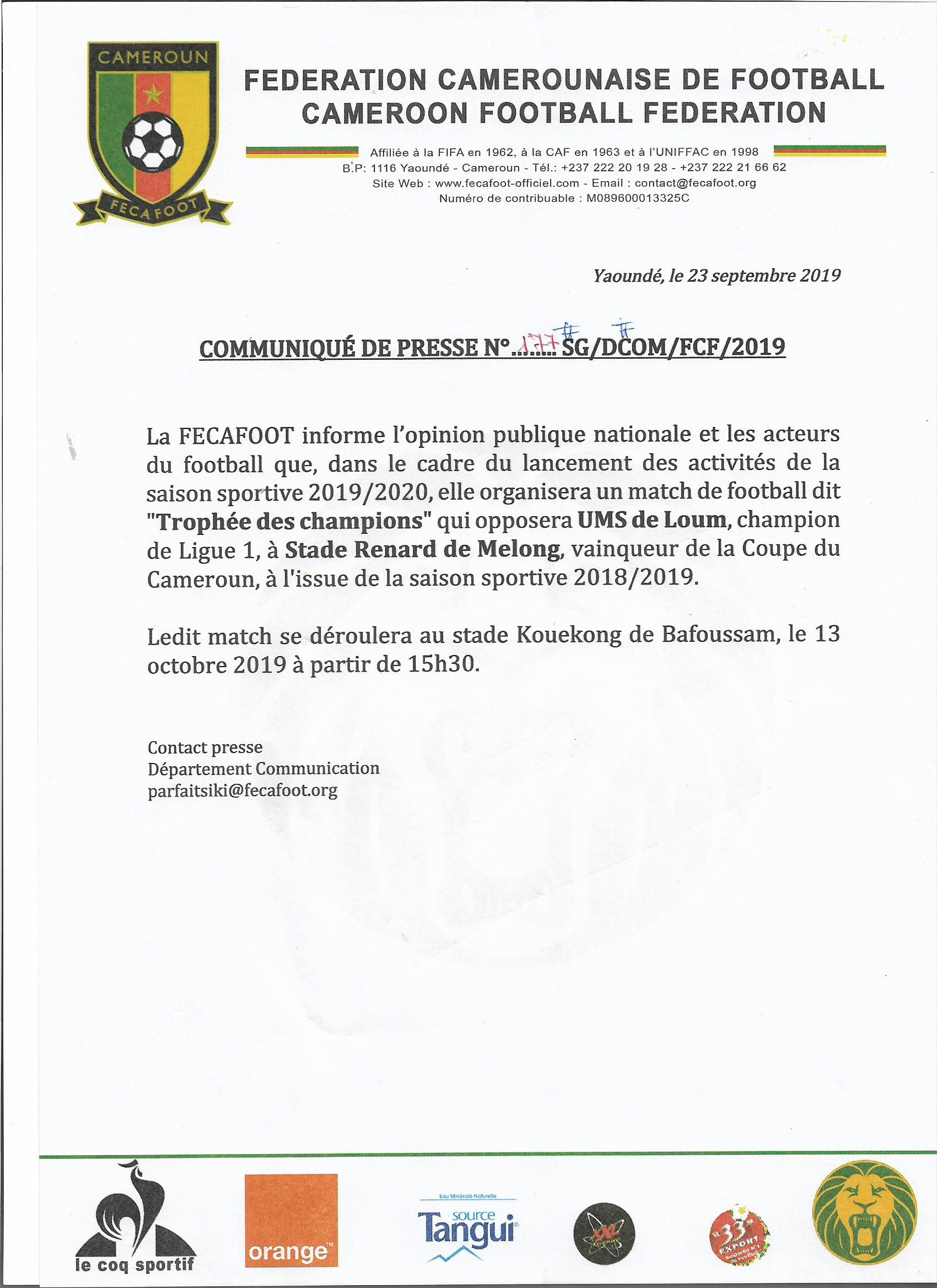 Quasiment certaine d’avoir remporté son bras de fer contre Pierre Semengué et la Ligue de Football Professionnel du Cameroun avec notamment cette missive de la FIFA interrogeant l’ingérence du gouvernement dans les affaires de football, la fédération camerounaise de football a programmé la Supercoupe, encore appelée Trophée des Champions, pour lancer la saison sportive 2019-2020. Le match opposera le Champion en titre, UMS de Loum, au vainqueur de la Coupe du Cameroun, Stade Renard de Melong.