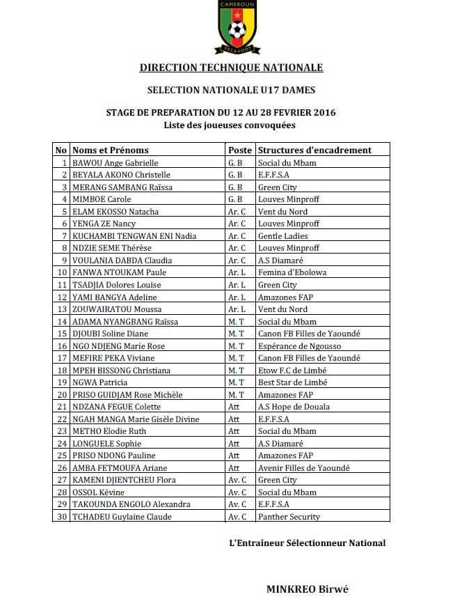 En vue de préparer le deuxième et dernier tour qualificatif à la coupe du monde U17 féminine, « Jordanie 2016 », contre l’Égypte, le sélectionneur national Minkréo Birwe a convoqué 30 joueuses. Soit 21 joueuses déjà présentes lors du précédent stage et neuf nouvelles appelées pour palier les insuffisances observées à certains postes.
