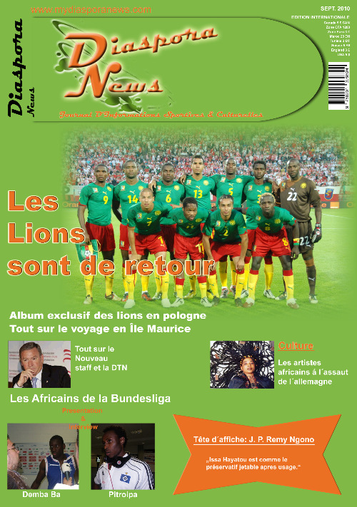 Le premier numéro de « Diaspora News » consacre un dossier spécial aux lions indomptables en se focalisant particulièrement sur la nouvelle dynamique commencée le onze Août dernier à Szczecin (Pologne). Les ressentes modifications dans l’organigramme de gestion de l’équipe nationale du Cameroun n’ont pas échappé au mensuel qui sera commercialisé en Afrique et en Europe. À coté des photos exclusives des lions indomptables, le magazine publiera également deux interviews vérités de Demba Ba (international Sénégalais) et Pitroipa (international Burkinabé).