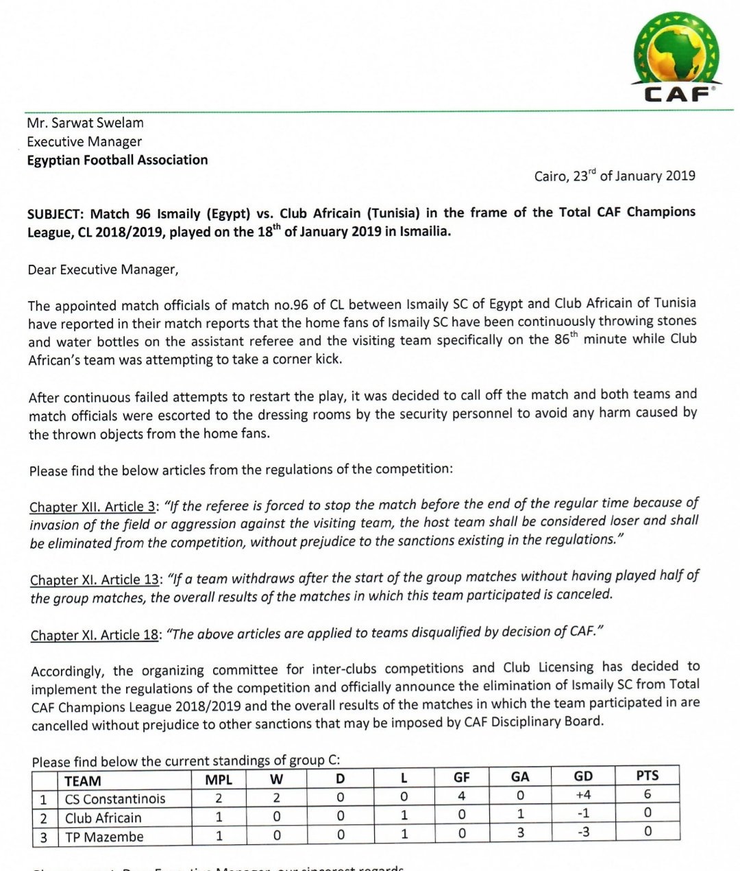 La CAF « a décidé d’appliquer le règlement de la compétition et d’annoncer officiellement l’élimination d’Ismaily FC », a expliqué l’instance africaine dans un courrier adressé à la Fédération égyptienne et publié sur son compte Twitter. « Les fans d’Ismaily FC ont continuellement jeté des pierres et des bouteilles d’eau sur l’arbitre assistant et l’équipe adverse », a-t-elle justifié. L’élimination du club a été décidée par la Commission d’organisation des compétitions interclubs et de la gestion du système d’octroi des licences de clubs.