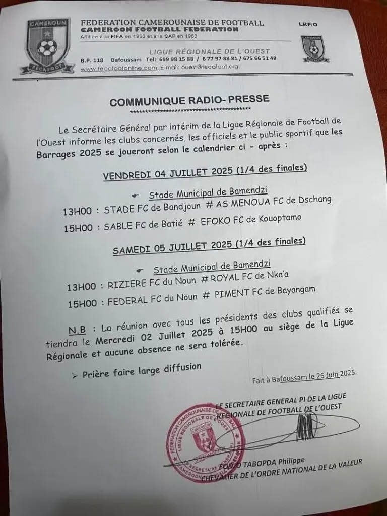 On est désormais fixé sur la date du début des barrages dans la région de l’Ouest. Après le différend entre Volcan Fc et la Ligue régionale, place au jeu. Le tournoi démarre le 4 juillet prochain avec les deux premiers matchs des quarts de finale au stade municipal de Bamendzi. L’un des grands favoris, Stade Fc de Bandjoun va lancer les hostilités contre As Menoua. Une rencontre qui promet des étincelles. Le coup d’envoi est prévu à 13 heures. Sur les mêmes installations dès 15 heures, Sables Fc de Batié aura fort à faire face à Efoko Fc de Kouoptamo.