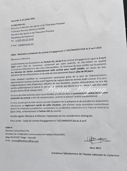 Le technicien se prépare d’ailleurs pour le prochain regroupement des Lions Indomptables au mois de septembre. C’est dans le cadre des éliminatoires de la Coupe du monde 2026. Au-delà du tollé soulevé par cette ‘’vraie fausse’’ démission, Marc Brys reste le sélectionneur national. Il est clair que la Fécafoot de Samuel Eto’o Fils n’a jamais voulu du Belge comme successeur de Rigobert Song. L’exécutif en place avait ses préférences. « La Fécafoot ne supporte pas Marc Brys. C’est connu. On a même vu des membres du Comex menacés de le limoger. Pourtant, il n’a jamais signé son contrat avec la Fédération. Heureusement que Marc Brys a fait une sortie pour démentir. Il doit se concentrer pour les prochains matchs des Lions. Pour le moment, il donne satisfaction. »
