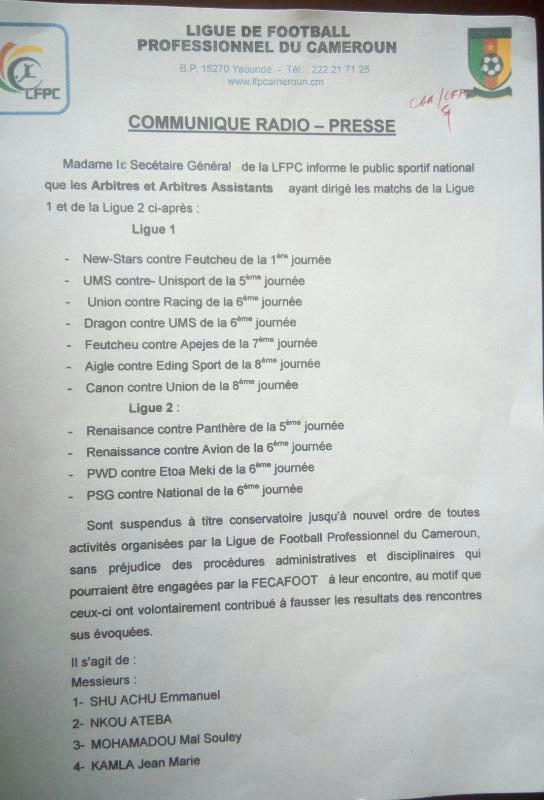 La première sanction de la Ligue du football professionnel du Cameroun (Lfpc) à l’encontre des hommes en noir est tombée ce mardi 12 avril 2017. Elle touche 17 arbitres et arbitres assistants, qui écopent d’une suspension à titre conservatoire, jusqu’à nouvel ordre de toutes les activités organisées par la Lfpc. La Ligue les accuse d’avoir volontairement contribué à fausser les résultats de certaines rencontres des championnats qu’elle organise.