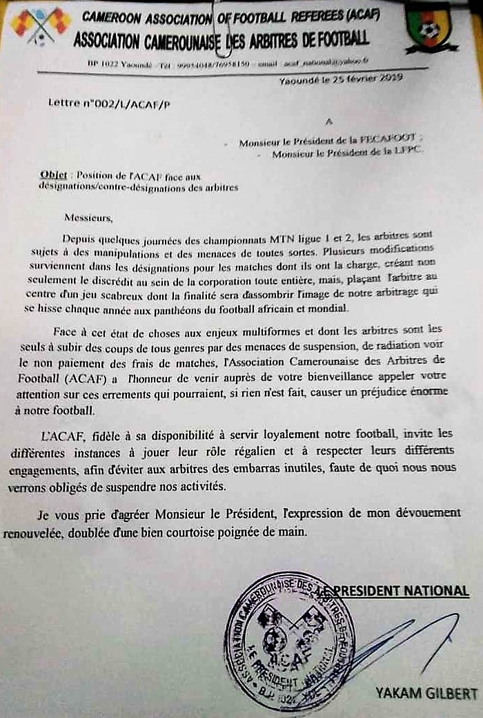 L’Association Camerounaise des Arbitres de Football estime que « les arbitres sont les seuls à subir des coups de tous genres par des menaces de suspension, de radiation voir le non-paiement des frais de matches ».