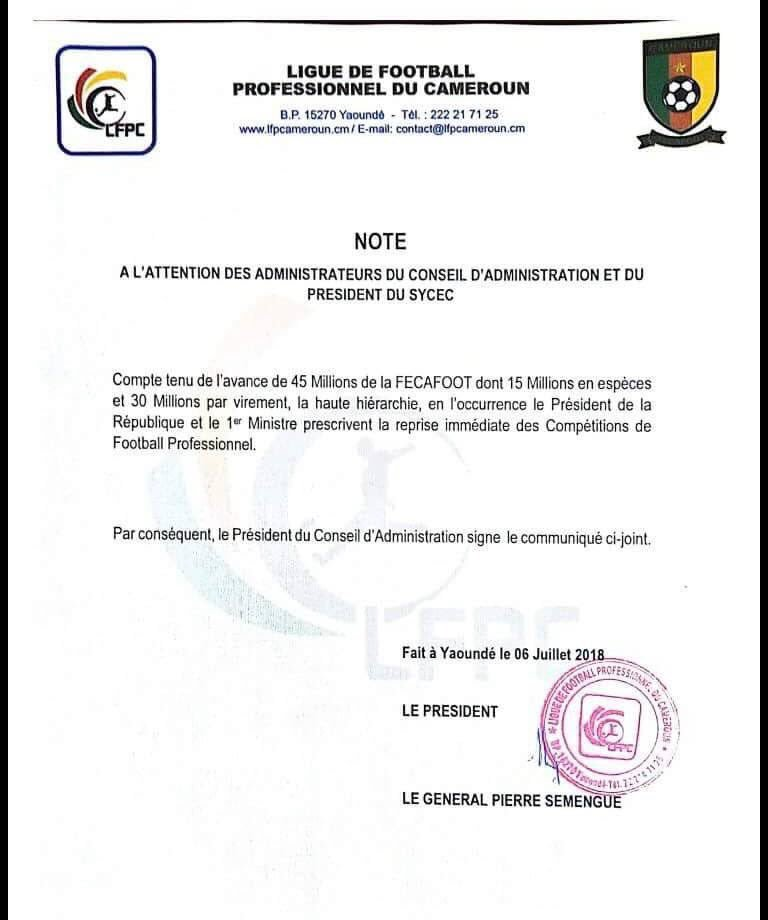 L’histoire a fait grand bruit ces derniers jours sur l’étendue du territoire national. Après la suspension des matchs des deux championnats professionnels, la plus haute personnalité du pays s’est impliqué dans la résolution rapide de ce qu’on pourrait peut-être appelé imbroglio. C’est qu’après avoir attendu de recevoir l’important reliquat de la subvention que devait lui verser la Fécafoot telle que négociée avant le début du championnat, la LFPC et le SYCEC ont décidé de faire un geste d’éclat.
