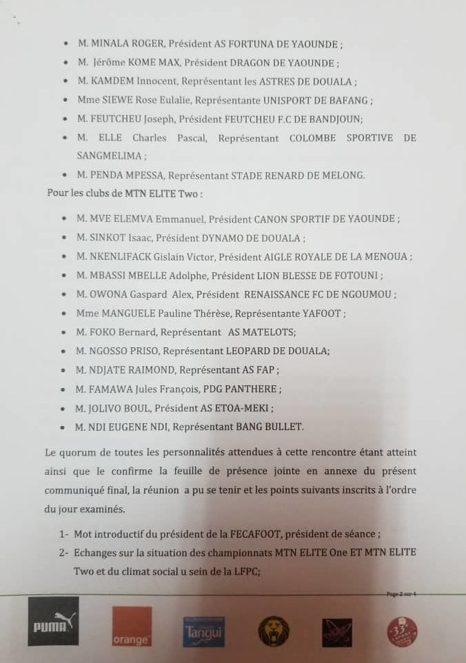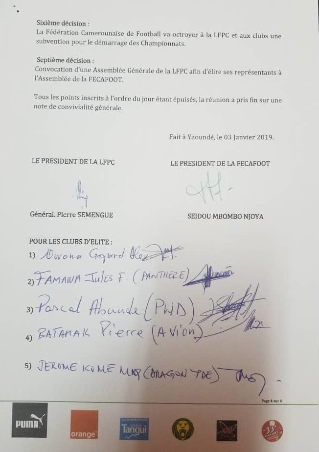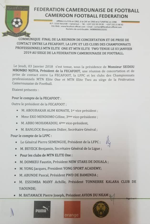 La date du 11 janvier 2019 a été arrêtée pour la tenue du prochain conseil d’administration de la LFPC. «Ce conseil doit arrêter à son tour la date de la tenue de l’Assemblée générale ordinaire de la LFPC », précise le communiqué final. Résolutions Il est créé un comité ad hoc chargé de réfléchir sur l’avenir de la LFPC. « Il sera présidé par le 1er vice-président de la FECAFOOT, Mr Aboubakar Alim Konaté et composé des représentants de la LFPC et des clubs», indique le communiqué qui a sanctionné les travaux. Mieux, la FECAFOOT va octroyer à la LFPC et aux clubs une subvention pour le démarrage des championnats. Enfin, il a été décidé de la convocation d’une Assemblée générale de la LFPC afin d’élire ses représentants à l’Assemblée de la FECAFOOT. Comme autre résolution arrêtée, le Général Pierre Semengue, après avoir exigé qu’une lettre d’excuse lui soit rédigée en sus des excuses qui lui ont été présentées lors de la rencontre, a accepté de retirer toutes les plaintes déposées à l’encontre d’Alex Gaspard Owona et Faustin Doumkeu. Lors de cette réunion de travail, le président de la Fédération, Seidou Mbombo Njoya, était accompagné de son premier vice-président Aboubacar Alim Konaté, la troisième vice-présidente Mme Céline Eko, le quatrième vice-président Abbo Mohamadou et du secrétaire général Benjamin Didier Banlock. Côté LFPC, le président Pierre Semengue et le secrétaire général Benjamin Beyeck ont répondu présents. Une vingtaine de présidents de clubs de Mtn Elite One et Mtn Elite Two ont assisté à ces travaux Une vue des présidents de clubs La réunion s’est tenue sur proposition du président de la FECAFOOT, qui depuis sa prise de fonction le 18 décembre 2018, a fait de la concertation permanente une des lignes directrices de sa méthode de management. Cette rencontre avait pour principal objectif d’évaluer le climat social à la LFPC et la situation des championnats de Mtn Elite One et Mtn Elite Two. « Nous avons abordé plusieurs autres sujets importants : les conditions de démarrage des championnats, le nombre de clubs, la subvention, le cas des plaintes pendantes devant les institutions judicaires… Les débats se sont déroulés dans un climat apaisé. La rencontre était plutôt conviviale », a affirmé Seidou MBOMBO NJOYA à la presse peu après la fin de la réunion.