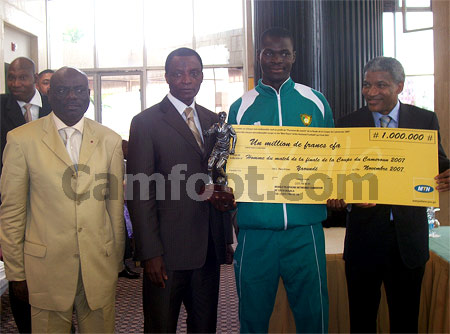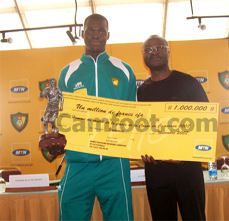 Le meilleur joueur de la 48ème finale de la coupe du Cameroun de football a reçu ce lundi 3 décembre 2007, à Yaoundé, son trophée de l’Homme du Match, qui lui a été décerné par la société de téléphonie mobile, Mobile telephone network (Mtn), sponsor officiel du championnat de football de première division. Daouda Kassali, la vedette du jour, a également reçu un chèque d’un montant de un million Fcfa, des mains de M. Jean Claude Ottou, Directeur général adjoint de Mtn Cameroun.