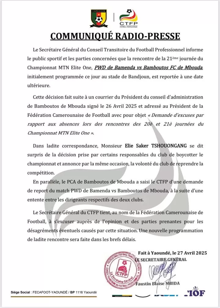 On vient d’apprendre que la rencontre a été renvoyée pour une date ultérieure par le Ctfp. Cette décision fait suite à un courrier du PCA, Elie Saker Tshouongang, daté du 26 avril. On apprend également dans cette correspondance du SG du CTFP que les deux présidents ont trouvé une entente. Pour de nombreux supporters de Bamboutos Fc, la Fécafoot de Samuel Eto’o doit verser ces primes de vice-champion et de super coupe.