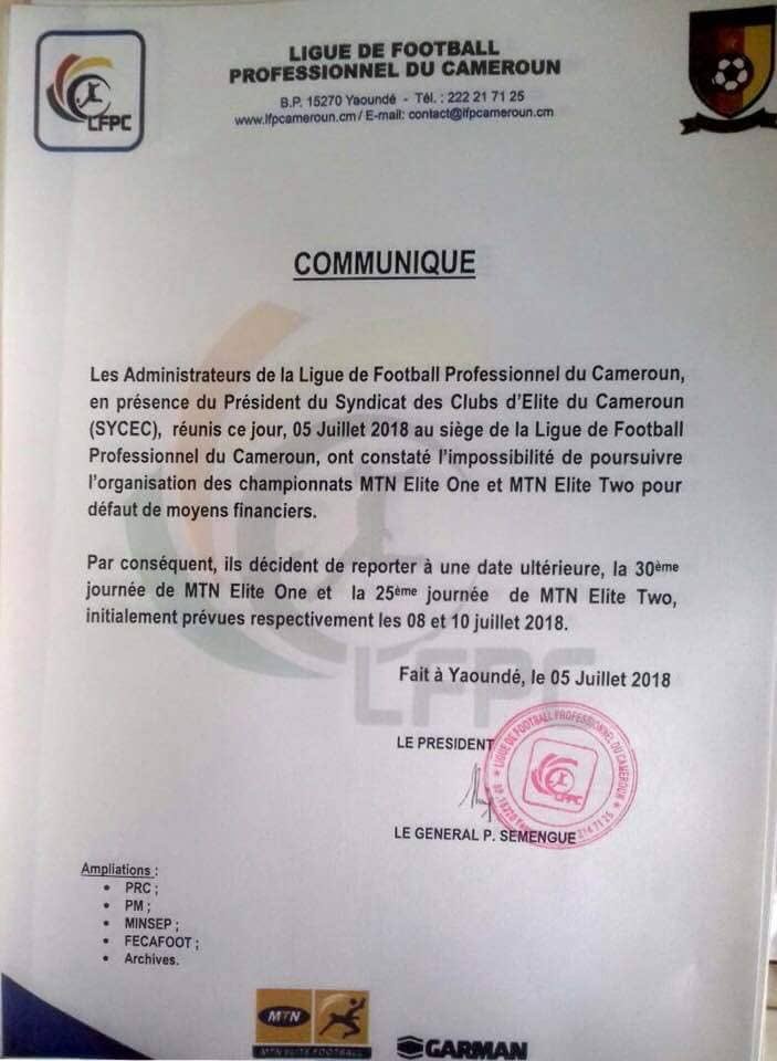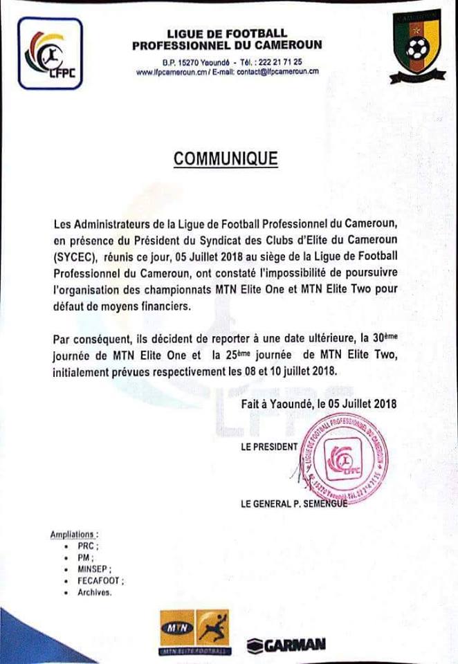 On ferme les portes. C’est la substance du communiqué conjoint publié par les dirigeants de la Ligue de Football Professionnel du Cameroun ce jeudi après une concertation avec le président du du Syndicat des Clubs d’Élite du Cameroun. Alors que les championnats tirent à leur fin, les promesses de financement ne se sont pas matérialisées de telle manière que les conditions de travail des joueurs sont déplorables. La Fécafoot de Maître Happi refuse de verser sa quote-part négociée pourtant en début d’année.