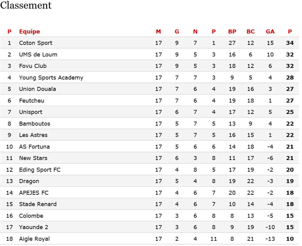 Tags: Aigle de DschangApejes de MfouAS FortunaAstres de DoualaBamboutos de MboudaColombe du Dja et LoboCotonsport de GarouaDragon de YaoundéEding de la LekiéFeutcheu FC de DjikoFovu de BahamNew Stars de DoualaStade Renard de MélongUMS de LoumUnion de DoualaUnisport de BafangYaounde II FCYOSA