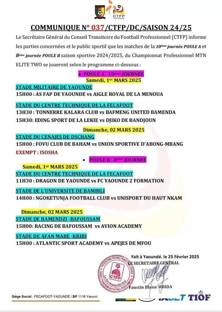 Dans la poule B, quatre matchs sont au programme pour le compte de la 8e journée. Dragon club de Yaoundé affronte FC Yaoundé 2. A l’Université de Bambili, Ngoketunja Fc affronte Unisport du Haut-Nkam. Et dimanche à Bamendzi, Racing de Bafoussam offre son hospitalité à Avion Academy alors qu’Atlantic Sport Academy reçoit Apejes de Mfou au stade de Afan Mabe de Kribi