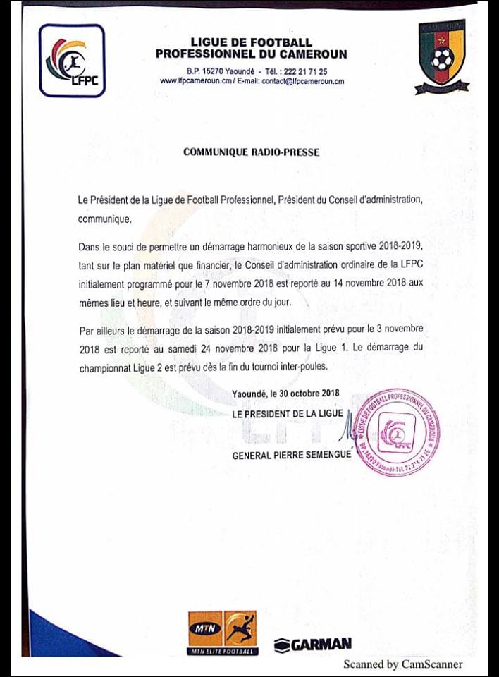 Le Général Pierre Semengué a décidé de repousser la date de démarrage des activités des deux ligues de football professionnel. Initialement programmées pour le 3 novembre, la ligue Elite One va finalement débuter le 24 novembre aux dates et lieux indiqués tel que le stipule le communiqué. Elite Two suivra après la fin du tournoi interpoules. Le Conseil d’administration est aussi repoussé du 7 novembre au 14 novembre.