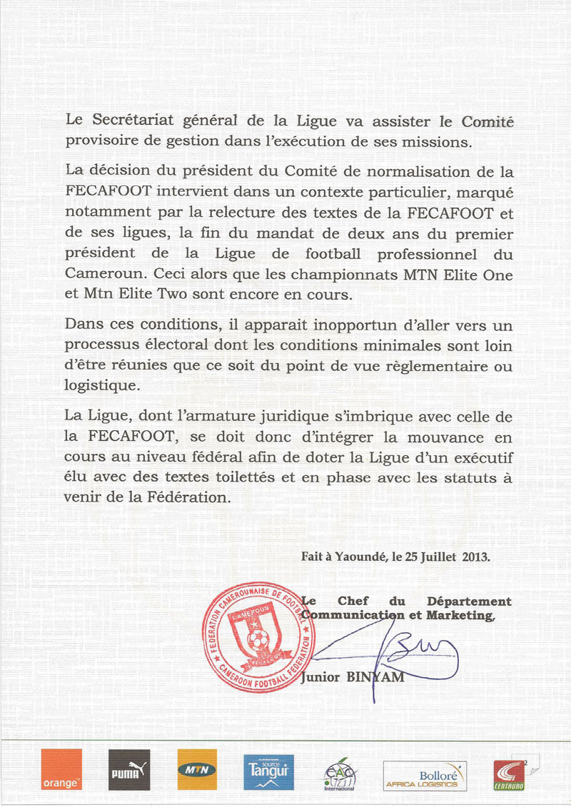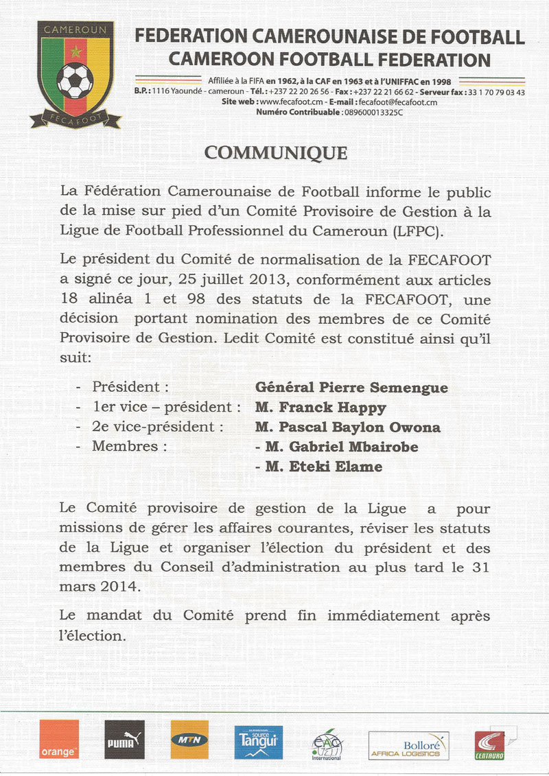 Une décision du Comité de normalisation a été signée ce 25 juillet à cet effet. Le Général Pierre Semengue a été maintenu comme président, avec pour 1er vice-président Franck Happi, le président d’Union de Douala, Pascal Owona Baylon, l’un des membres du Comité de normalisation et ancien président de la Fécafoot. Il a pour membres, Gabriel Mbaïrobé, le président de Coton sport de Garoua et Eteki Charles Dikongue, le président de Tiko United.