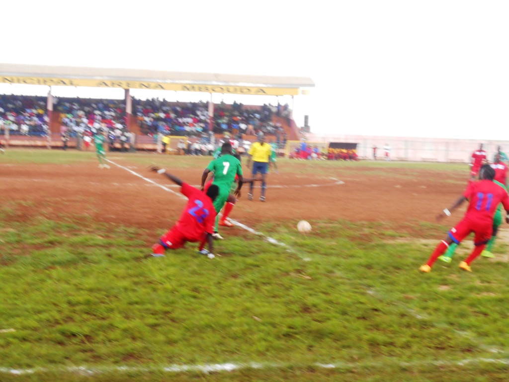 La soif de victoire des canonniers s’est vite fait ressentir. Dès le coup, ils sont maitres du ballon. Très remuant, son avant-centre Nfor Nelson donne des sueurs froides aux défenseurs adverses qui, pris de panique, deviennent nonchalants dans leurs relances. Suite à un mauvais renvoi de la balle de la tête d’Elice Nyeck, défenseur central de Bamboutos Fc, l’attaquant du Kpa Kum crucifie, d’un lobe magistral le portier des locaux (0-1, 17ème). Après ce but, une pluie s’invite à la partie. Mais davantage pour dégrader l’état de l’aire de jeu. Et les 22 acteurs sont contraints à privilégier les balles aériennes. Dans ce registre, les mangwa Boy’s semble tirer leur épingle jeu. Puisque dès lors, c’est eux qui donne le rythme au match. Respectivement à la 25ème et 28ème, Lané Lakem et Elice Nyeck passent à côté de l’égalisation. Aussi, la frappe de Dang A Bessike trop croisée qui rase le montant gauche des buts du Canon, gardés par Djafarou Issa, ne permet pas aux locaux de remettre les pendules à l’heure avant la pause.