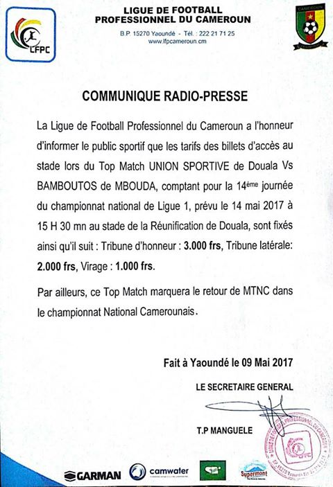 La première sortie de ce sponsor officiel des championnats Ligue 1 et 2 se fera lors du top match de la 14e journée de Ligue 1, qui opposera Union sportive de Douala à Bamboutos Fc de Mbouda, le 14 mai prochain au stade de la Réunification de Douala. Pour la circonstance, la Ligue a revu à la hausse les tarifs des billets d’accès au stade. Le virage passe de 500 F Cfa à 1000 F Cfa, la tribune latérale de 1000 F Cfa à 2000 F Cfa et la tribune d’honneur de 2000 F Cfa à 3000 F Cfa.