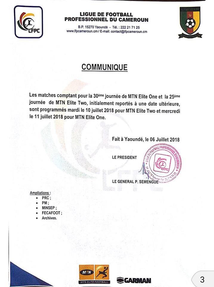 Satisfaite de la tournure des événements, avec l’accord du Syndicat des Clubs d’Elite, la Ligue a reprogrammé les activités de la 30e journée de l’Elite One et la 25e journée de l’Elite Two.