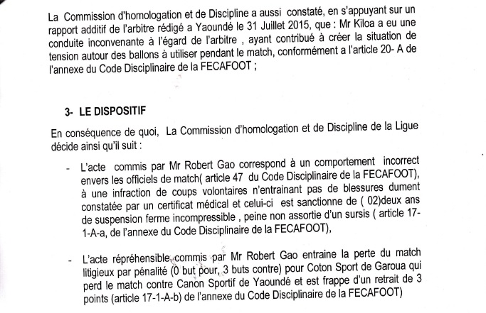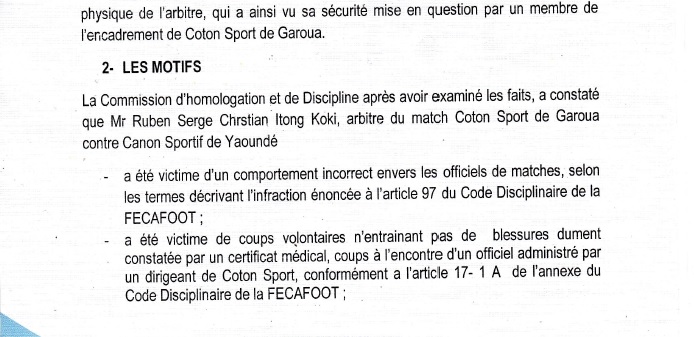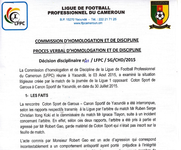 La commission d’homologation et de discipline de la Ligue a frappé fort. Dans le litige qui opposait le Canon Sportif à Coton Sport de Garoua, la LFPC a décidé d’attribuer les trois points de la victoire à l’équipe de Yaoundé.