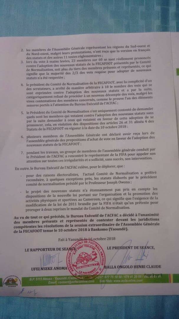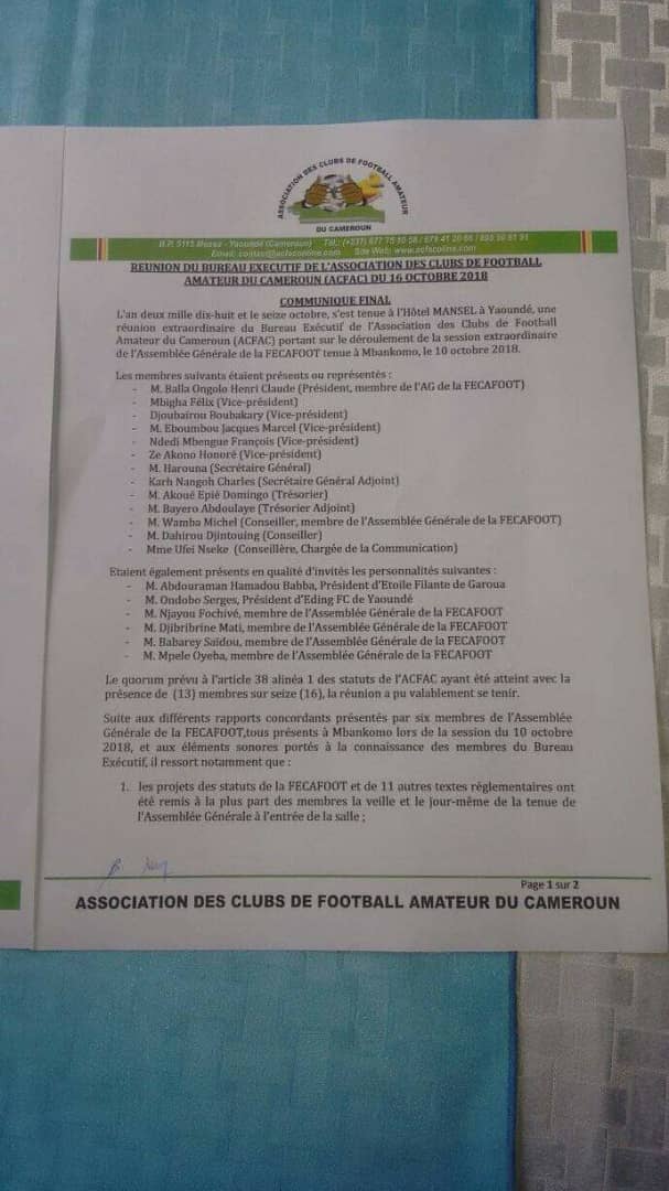 Résolutions de la réunion du Bureau Exécutif de l’Association des Clubs de Football Amateur du Cameroun (ACFAC) du 16 octobre 2018, sur l’adoption litigieuse des nouveaux statuts de la FECAFOOT…