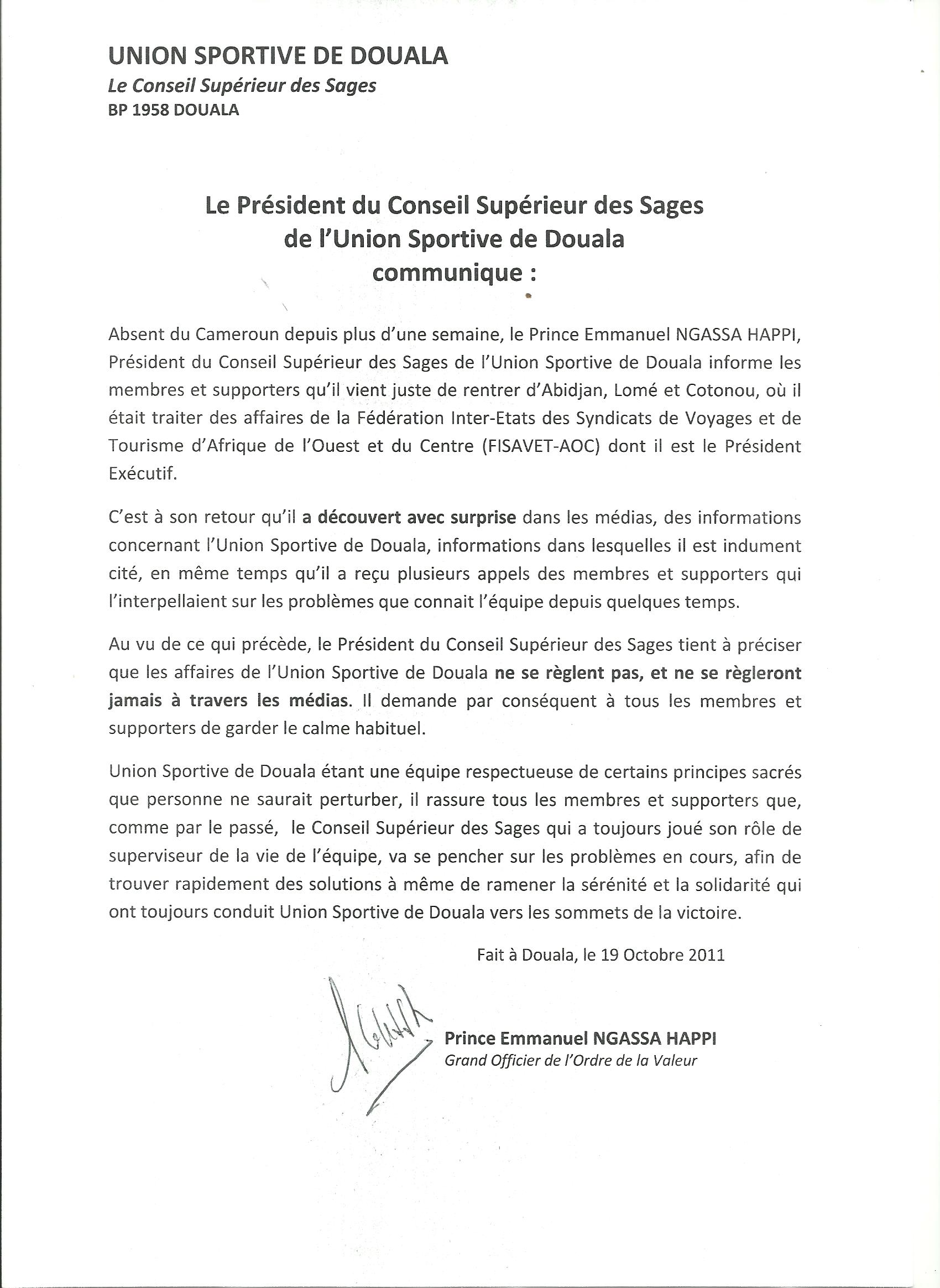 Ngassa Happi indique ne pas se reconnaitre dans ces propos. il a commis un communiqué aux supporteurs de l’Union de Douala dont la teneur suit: