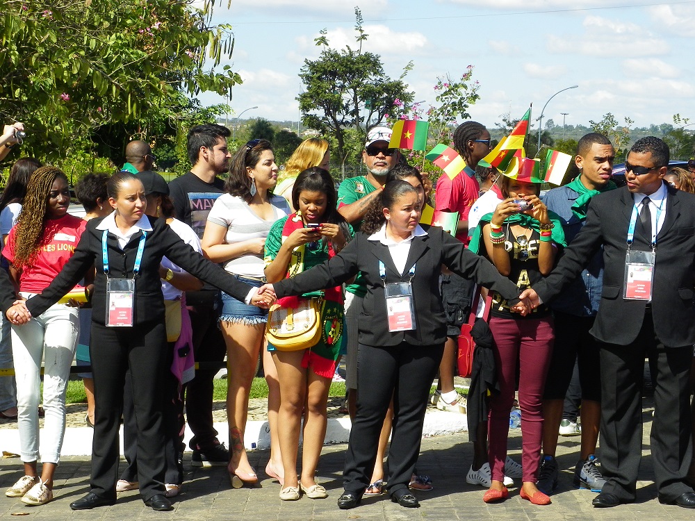 Il y’avait du beau monde devant l’hôtel des Lions. Un accueil de taille pour une équipe déjà éliminée de la Coupe du Monde. Des fidèles parmis des fidéles qui ont fait entendre la voix du Cameroun, non loin de l’hôtel des brésiliens. Ambiance de la tanière, ambiance de l’arrivée …