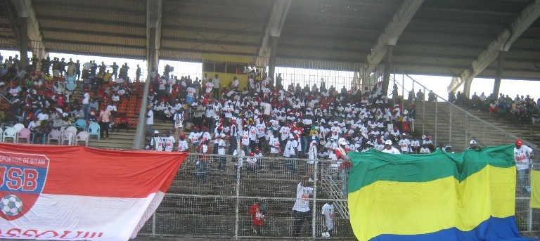Le match retour du tour préliminaire de la Champions league africaine s’est joué samedi dernier à Douala. Mais dans les gradins, on se croirait à Libreville ou à Bitam. Les supporters gabonais en mettaient plein la vue. Le vert-jaune-bleu (drapeaux gabonais) déployé aux 4 coins du stade. La tribune B est vêtue du rouge-blanc-bleu, les couleurs de l’Union sportive Bitam (USB). Les fans, un millier, étaient surexcités. Tout est mis à contribution pour motiver les joueurs. Vuvzela. Castagnettes. Sifflets. Bâtons. Battement des mains. Chants de ralliement. Les deux bras levés, les supporters des visiteurs donnent de la voix.