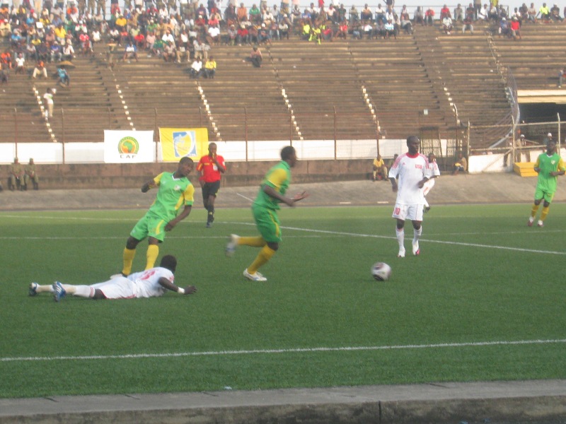 17’. Bonaventure Sokambi, après un festival de dribles, exécute un centre en retrait. Le gardien Hugo Nyamé, s’y prend en deux temps pour capter le cuir. Le flanc gauche des Astres emmené par Bebey Kingue manque d’inspiration. La défense en ligne des Astres est préjudiciable pour son maigre fan club. Les supporters des jaunes et vert ont des palpitations. A la conclusion d’une action collective, André Biyogho Pocko, le milieu relayeur des visiteurs envoie une lourde frappe s’écraser sur la transversale du gardien camerounais, battu. Le fan club des Gabonais hurlent de désespoir.