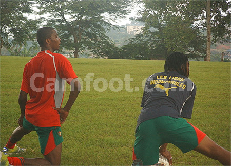 Eto'o et Song à l'étirement ce lundi après-midi au complexe BEAC de Yaoundé