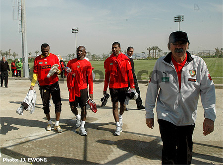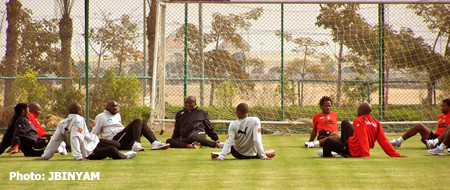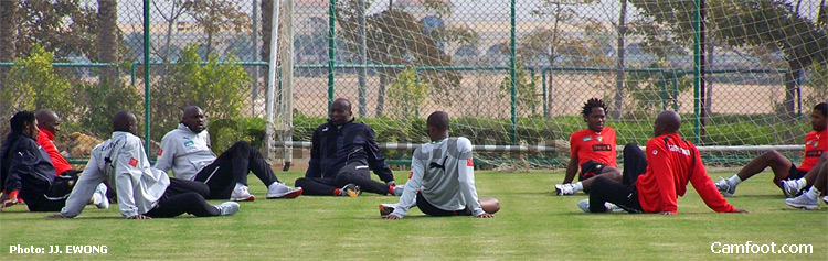 Sur le terrain, Artur Jorge organise l’équipe en trois groupes. Celui des joueurs qui ont débuté la rencontre la veille contre l’Angola. Il se charge d’ailleurs de diriger ce groupe en compagnie de Jules Frédéric Nyongha. Un groupe constitué des trois gardiens de buts sous la férule de Jacques Songo’o et le reste de l’équipe sous la supervision de Raul Aguas. On signale également que, comme lors des précédentes séances, Patrick Mboma prend part à cet entraînement sur le terrain comme joueur. Une présence de « Magic » Mboma sur le terrain qui suscite quelques interrogations sur son possible retour au sein des Lions. Mais pour le meilleur joueur africain 2000, il s’agit simplement d’entretenir la forme.