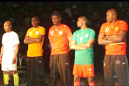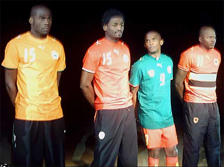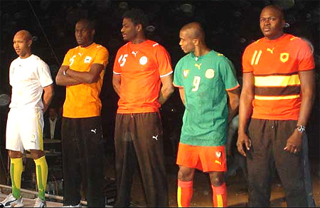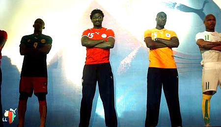 présentation du maillot officiel les stars Samuel Eto’o du Cameroun, Guy Demel de Côte d’ivoire, El-hadji Diouf du Sénégal et Radhi Jaïdi de Tunisie.