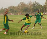 3. Le gardien Souleymanou était au four pendant les entrainements de ce jeudi. Ici se relevant avec l'aide de Bikey et le préparateur physique