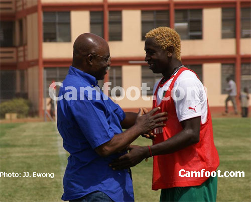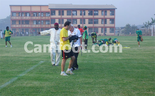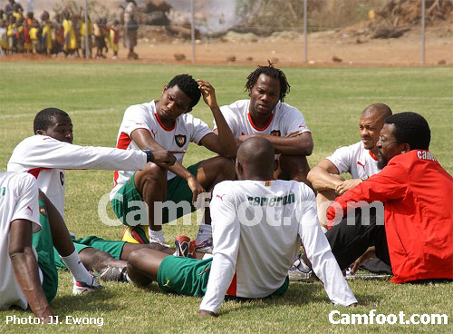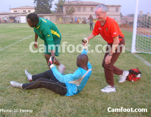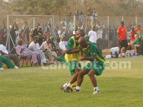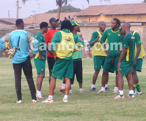 Il s’est agit dans un premier temps de Geremi Njitap, Rigobert Song, Souleymanou, Gilles Augustin Binya, Atouba, Song Bilong Alexandre, Modeste Mbami, Achille Emana. Quinze minutes ont suffit à l’allemand pour les voir à l’œuvre avant de faire appel à un autre groupe, tout ceci non sans prendre les notes dans un calepin qu’il tenait en main. Le deuxième groupe était constitué de Stéphane Mbia, Joël Epalle, Jean II Makoun, Idrissou Mohamadou, Landry Nguemo, Tchato Bill, Essola Tchamba et Benoit Angbwa. C’est après cette autre phase que le technicien allemand s‘est résolu à organiser un « deux camp », où semble se dégager ce qu’on peut appeler de probable onze entrant de samedi prochain contre la Zambie.