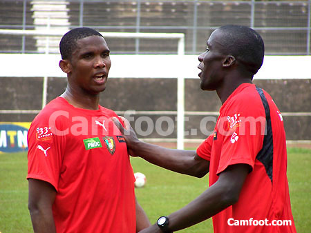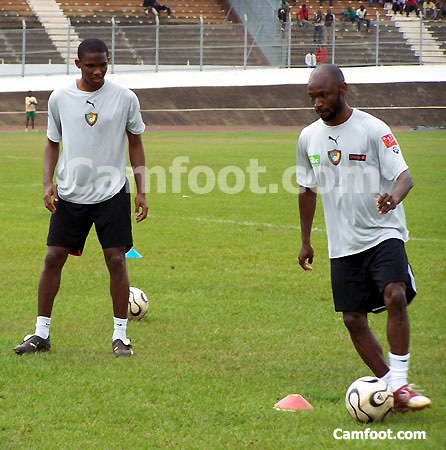 L’ambiance était détendue entre certains joueurs. Entre les différents ateliers proposés par les deux entraîneurs Jules Nyongha et Thomas Nkono, Emana s’amusait avec Makoun, Eto’o avec Angbwa, et on surprenait même le capitaine Rigobert Song hilare et en grande conversation avec Ambane, le seul « amateur » présent au stage, visiblement bien content de s’intégrer rapidement. Un ramasseur de balles chanceux s’accordait lui une mini séance de passes et de jongles avec le Pichichi en personne, près des filets situes cote tableau d’affichage, sous les acclamations du public complice.