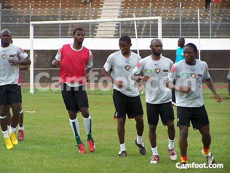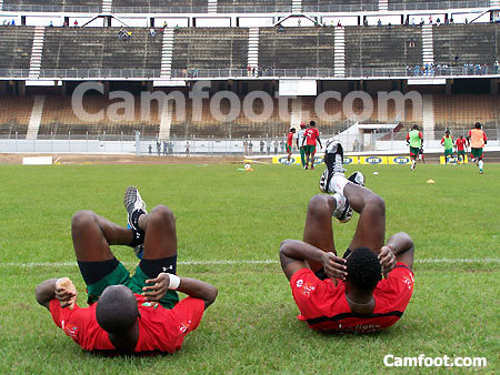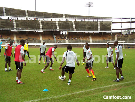 10h15, à l’arrivée du car de l’équipe nationale au stade Omnisport, Samuel Eto’o, absent du décrassage de la veille gagnait sans conteste au concours de l’applaudimètre. Apres avoir parlé devant les cameras de la télévision nationale, le Pichichi s’est refusé à s’exprimer au micro des autres media, à qui il a donné rendez-vous « vendredi, lors de la conférence de presse« . L’entraînement pouvait débuter pour le groupe convoqué par un Jules Nyongha « content que l’equipe soit au grand complet pour pouvoir travailler maintenant plus sereinement« . On remarquait toutefois Stéphane Mbia et Idriss Kameni se préparer à part durant la séance en entier, qui se résumait pour les dix-huit autres joueurs au traditionnel ‘taureau‘, puis à des étirements pour débuter.