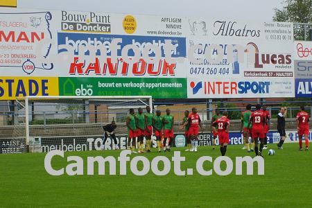Les flamands de Denderleeuw ont eu un avant goût du match amical qui aura lieu le Jeudi 31 Mai 2007 entre les lions indomptables et leur équipe fanion fraîchement promue en première de Jupiler League. En levée de rideau (14 H 00), les U21 de la diaspora Camerounaise ont neutralisé l’équipe réserve du F.C.V Dender. Après avoir longtemps mené au score, les camerounais, très dynamique à l’image de Agoua-Tossou Jean Joseph, se sont fait rattrapés en fin de rencontre pour se séparer sur le score de 2 buts partout.