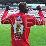 Rapidement intégré dans le plat pays, comment vit l’homme aux 1,90m son statut de meilleur buteur de Belqique?  » Je suis un attaquant, je ne dois pas être surpris de marquer » répond le numéro 14 de l’Excelsior Mouscron, qui tient bien sa comptabilité: « j’ai marqué huit buts, équitablement de la tête, du pied droit et du pied gauche. J’ai donné quatre passes décisives et provoqué quatre pénalties. Si je les tirais en plus, vous voyez où je serais actuellement? » Tomou en laisse le soin au deuxième buteur du club, le bosniaque Custovic, qui lui est à six buts. Il faut aussi gérer la pression médiatique qui monte peu à peu chaque jour. » Après le match contre le Standard, j’ai dû signer des maillots pour les supporters dans la boutique du club jusqu’à minuit! Sans compter la conférence de presse, et la journée de tournage avec la télévision belge la veille« .
