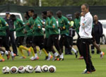 Place maintenant au ballon. Jabulani, aux couleurs arc-en-ciel. Place aux professionnels du ballon rond. D’abord au sélectionneur national, Paul Marie Le Guen. Ses collaborateurs et lui sont payés pour écrire pour nos champions la partition qu’ils joueront une fois sur le terrain. Ils nous disent qu’ils ont travaillé dans d’excellentes conditions. Je peux le témoigner pour avoir séjourné dans le même hôtel qu’eux à Klagenfurt.