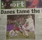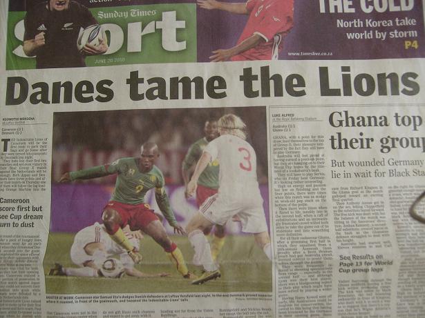 Les journaux locaux en ont fait les titres. Un des plus gros tirages, le « Sunday Times Sport », ne manquait pas de rappeler: « les danois domptent les lions ». Une première des pages consacré à l’élimination de l’équipe nationale du Cameroun, première a connaître son sort sur les 32 pays présent en Afrique du Sud pour la 19e édition de la coupe du monde football. Le texte est sans appel: « les lions sont les premiers à plier bagage après avoir été transformés en petit chat ».