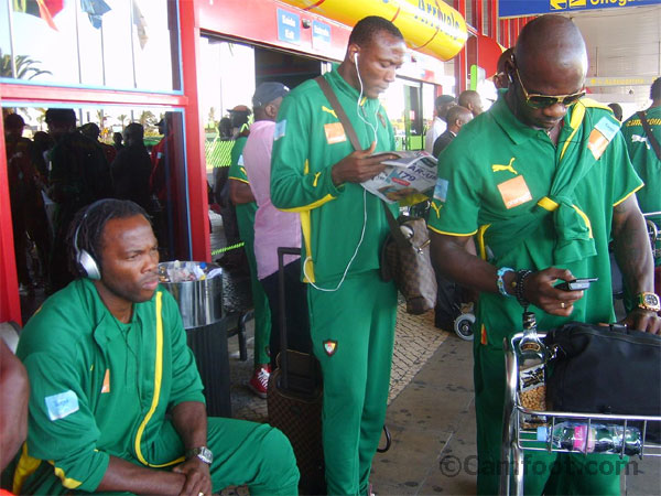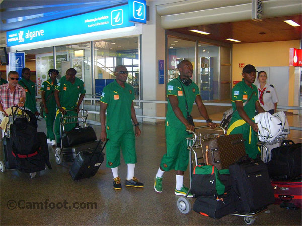 Tous de vert vétus, ce sont des sportifs avec une mine un peu entachée de fatigue qui va longer le hall de l’aéroport international de faro. À la tête des joueurs, Paul Le Guen et son adjoint seront comme des guides. Derrière les techniciens Français, Jean 2 Makoun visiblement un des rares à procurer de la bonne humeur en partageant son sourire difficilement masqué par ses lunettes solaires. Achille Emana, Stéphane Bikey, Geremi Njitap, Souleymanou et quelques uns vont emboiter rapidement le pas en embrassant la bienvenue des 4 Camerounais qui branlaient haut le drapeau national. Dix minutes plus tard, les lions indomptables vont rapidement monter dans le bus stationné avant de prendre la direction de Vilamoura, situé à une vingtaine de Faro.