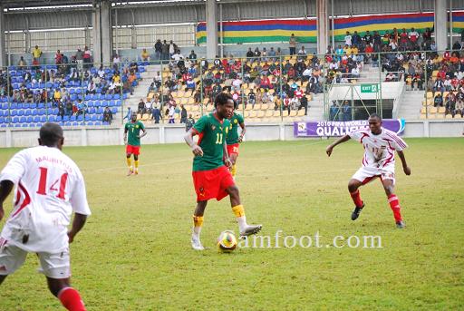Il n’y aura pas de temps d’observation. Les lions vont se jeter dès la première minute à l’attaque. Achille Webo et Eto’o fils vont se montrer remuants malgré la qualité désastreuse de la pelouse. À la 5e minute, suite à une faute commise sur Makoun, Geremi exécute un coup franc qui va légèrement passé au dessus de la transversale. Le ton est ainsi annoncé dans un système en 4-3-3 mis sur pied par Otto Pfister. Trois minutes plus tard, Webo va de nouveau de signaler dans la surface sans avoir de succès. Les mauriciens jusque là timides vont se réveiller grâce à Sophie qui va profiter d’un mauvais dégagement de la défense Camerounaise pour se montrer dangereux. Une tentative infructueuse qui va remonter les lions. Décalé sur le coté gauche, Eto’o va facilement effacer d’un feinte son vis-à-vis avant d’adresser un centre sur Bikey qui va d’abord se servir de la tête puis du pied pour ouvrir le score. On joue la onzième minute de jeu. Dès cet instant, le match va se jouer à sens unique car les lions vont multiplier des actions de but. Il faut finalement attendre la 27e minute de jeu pour voir une belle combinaison entre Eto’o, Webo et Makoun qui va servir un caviar au 9 pour le deuxième but. Les réactions mauriciennes vont seront plutôt sans effets. L’exemple de ce débordement de Lemince sur le coté qui va centrer sur Sophie trop court à la réception. Les deux équipes vont aller à la mi-temps sur le score de 2 buts à 0 à l’avantage du Cameroun.