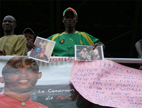 Monsieur Niyonzima est un Rwandais qui adore Samuel Eto’o Fils le goleador Camerounais. Lors du premier match du Cameroun dans cette compétition contre le Ghana, il a dressé les photos du joueur de Barcelone dans un coin du stade ainsi que les photos qu’ils avait prises avec le joueur Camerounais et ses deux enfants lors du match des éliminatoires de la Can 2008 disputé ici même à Kigali. Pour lui Samuel Eto’o fait la fierté de l’Afrique et chaque fois qu’il assiste à un match au stade National Amahoro, il dresse les photos de Samuel Eto’o au même endroit au stade. Ce mercredi, le Cameroun croise de fer avec le Rwanda; Niyonzima va-t-il une fois de plus installer les photos de Samuel Eto’o ? On le saur dans quelques heures.