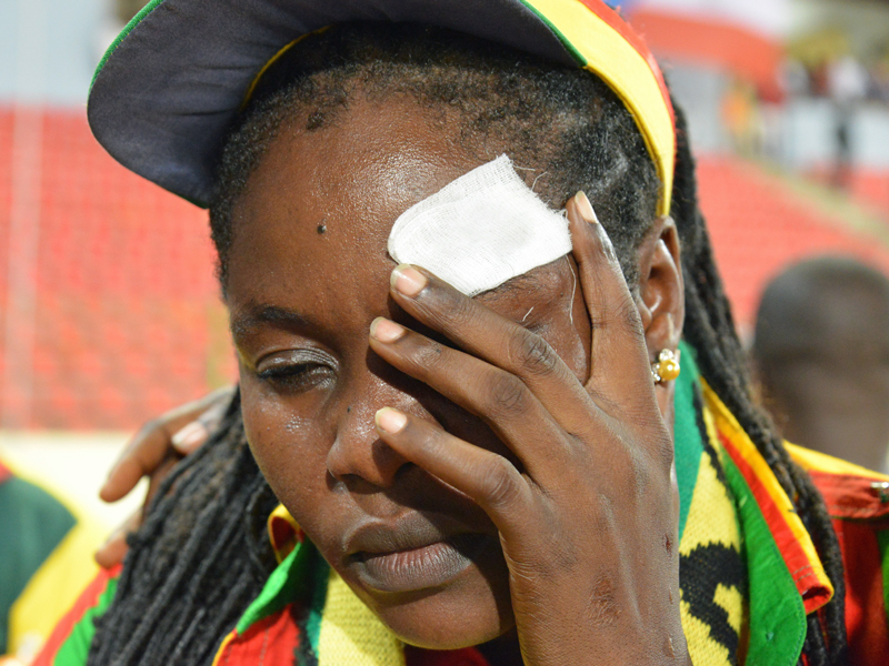 A la pause, l’arbitre Eric Otogo et ses assistants quittent le terrain sous les boucliers de la police. Ils sont bientôt imités par les joueurs ghanéens qui regagnent les vestiaires sous escorte, par petits groupes. Cette fois, ce sont des canettes et des pierres qui s’abattent sur l’aire de jeu. Les joueurs équato-guinéens appellent le public au calme. En vain.