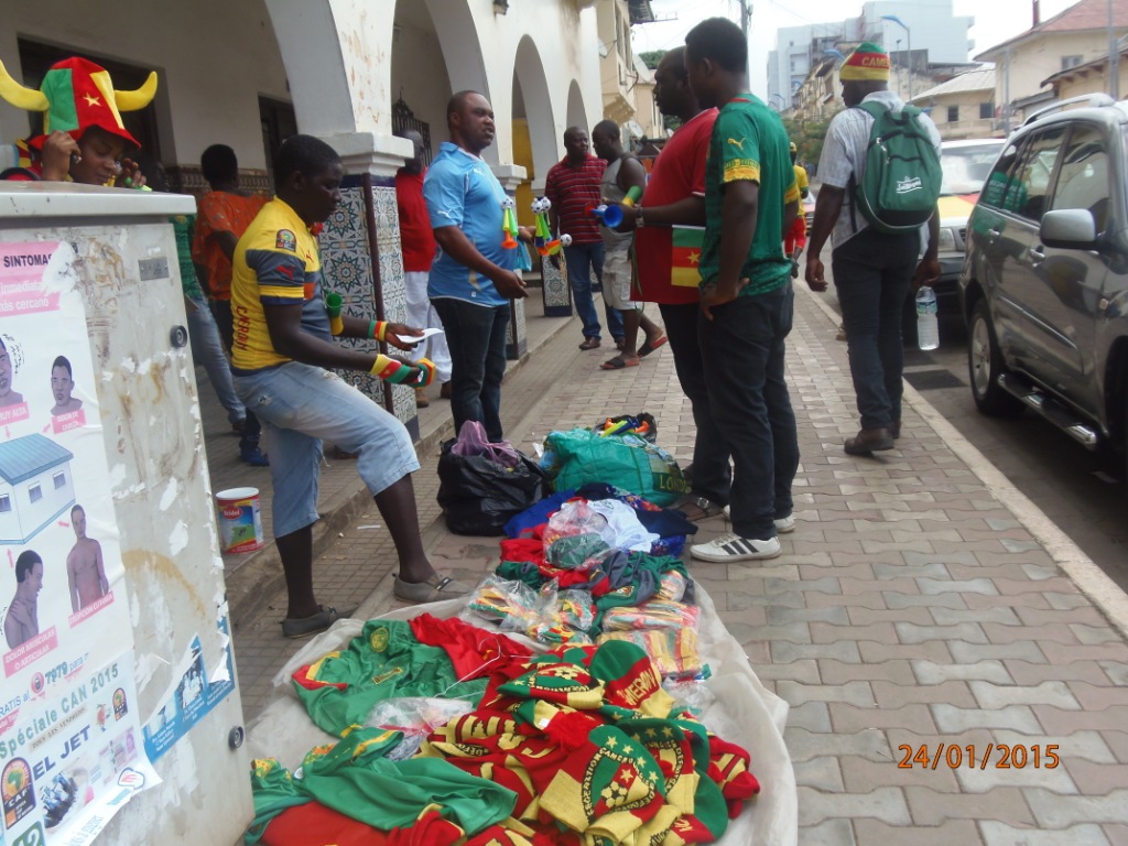 Dans la floppée de buvettes qui décorent le coin, les disciples de bacchus ont déjà assailli les tables de boissons alcoolisées ou non, la grande majorité parée de gadgets aux couleurs nationales, vert-rouge-jaune. Ces objets, très précieux ici pour la circonstance font courir les supporters des Lions, au bénéfice des vendeurs. Tenez, pour revêtir un maillot du Cameroun de troisième ou de quatrième choix, il vous faut débourser au minimum 10 000 FCFA, ou encore 500 FCFA pour se faire tatouer sur la peau un drapeau aux couleurs du Cameroun. Le prix des gadgets varie entre 500 et 2 000 FCFA, soit dix fois le prix d’un gadget vendu au Cameroun pour la même circonstance.