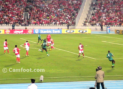 A quelques secondes du coup d’envoi, les Ultra Ahlawi (groupe de supporters hyper organisés qui suivent Al Ahly partout et se démarquent par des chants et des mouvements d’ensemble qui leur sont propres) lancent le feu dans les gradins. Pompiers et policiers s’affairent pour éviter tout débordement. C’est sur ces entrefaites que le match démarre en trombe côté Al Ahly qui ne veut pas donner du répit aux cotonculteurs, en témoigne ce face à face Barakat/Kassali dont le second sort vainqueur. Nous jouons la deuxième minute. A la troisième minute, une faute de Ousmaila Baba sur Gilberto entraîne un coup franc. Abou Treika trouve la tête de Wael Gomaa qui ne se fait pas prier pour loger la balle dans les goals de Daouda Kassali, impuissant. Cotonsport essaie tant bien que mal de se ressaisir, Kamilou esseulé n’arrive pas à combiner avec Ousmaila Baba, pas du tout dans son assiette. Au moment où Cotonsport récupère la domination du milieu de terrain et cherche à contenir la fougue des égyptiens, Kingué Mpondo commet une faute sur Abou Treika à la quatorzième minute. Le coup franc tiré par Ahmad Hassan est dévié de la tête par l’angolais Amado Flavio pour le deux Zéro.