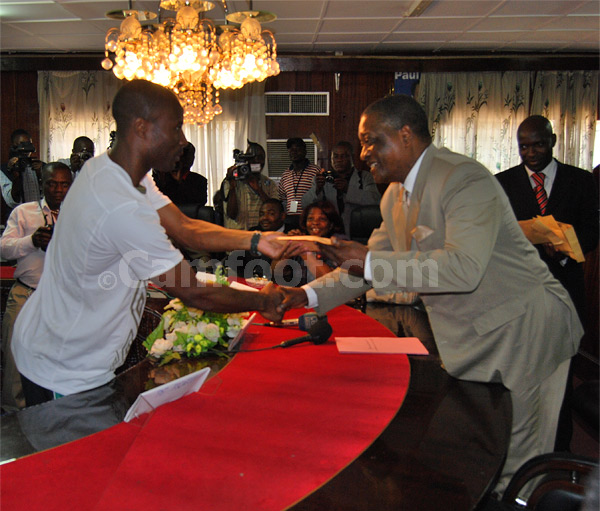 Alain Ouombleon recoit son enveloppe des mains du Minsep