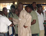 C’est une délégation de 25 personnes qui ont rempli les formalités administratives du voyage. Ce sont notamment 18 joueurs, quatre coaches (Alain Ouombléon, son adjoint Haman Gabriel, Mbainassem, le coach des gardien et Bertin Ebwelé, le coach envoyé en renfort à Cotonsport par le ministère des Sports), le Secrétaire général (M. Touré), un médecin (M. Yapélé) et un intendant. Le président Gabriel Mbairobé, suivra le club au Nigeria ce vendredi indique une source. Pendant l’heure qu’a duré l’attente des joueurs à l’aéroport international de Douala, les joueurs ont paru très détendus, devisant sur divers sujets.