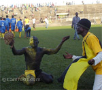 Des supporters de l'Aigle fêtent la victoire des leurs sur la pelouse du stade de la Réunification