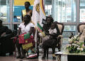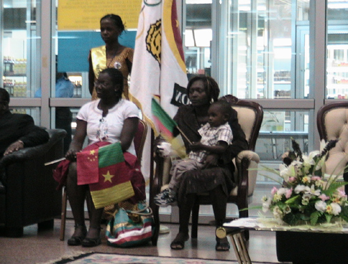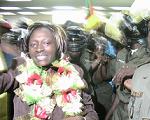 C’est à 18h14min qu’un appareil de la compagnie Air France s’est immobilisé sur la piste de l’aéroport international de Yaoundé Nsimalen ayant en plus à son bord le ministre des Sports et de l’éducation physique, Augustin Edjoa, le ministre délégué à la Présidence, chargé des Assemblées, Grégoire Owona. En début de semaine, les autres athlètes de la fameuse Cameroon olympic team sont rentrés dans l’anonymat total après leurs échecs respectifs en Chine. L’apparition de Françoise Mbango arrache des cris hystériques à des dizaines de fans, parents, amis et connaissances. L’impressionnant déploiement des forces de maintien de l’ordre cèdent sous la pression de la foule et des journalistes, photographes et cameramen de plusieurs média accrédités pour la circonstance. L’interdiction d’un officier de police de filmer l’appareil Air France « pour des raisons sécuritaires » n’est pas respectée.