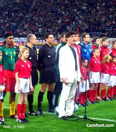 Les Lions vont s’échauffer également. Rudolph Douala est titulaire à droite et l’équipe jouera en 4-4-2, selon la feuille de match que l’on vient de distribuer sur la main courante. Schäfer s’approche des titulaires qui sont en cercle, donne les derniers conseils et le match va être lancé par les nouveaux maillots rouges géants de la sélection allemande portés par des volontaires et qui les présentent au monde entier : » on jouera en rouge pour effrayer ces camerounais! » pouvait-on lire dans la presse de la veille.